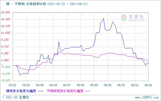 据生意社价差分析工具显示,镍和不锈钢价格相似。镍变化幅度更大。