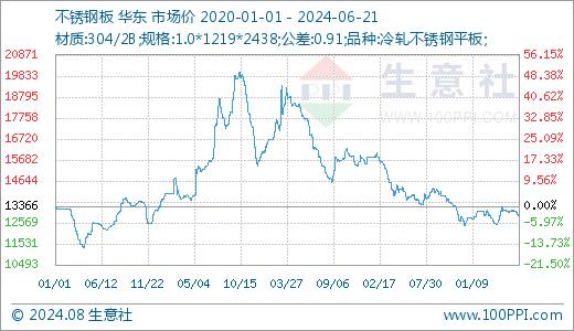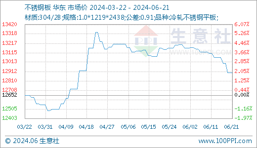 据生意社价格监测,本周不锈钢价格小幅下跌。截止6月21日,现货304/2B不锈钢平板1.0*1219*2438(公差0.91)的日均价为现报价12900元/吨,较周初下跌0.77%,同比下跌6.18%。
