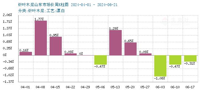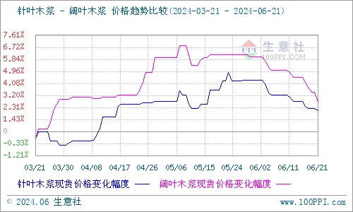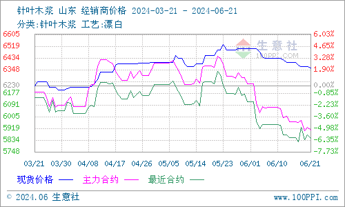 据生意社商品行情分析系统监测:本周针叶木浆价和阔叶木浆价格持续下落。6月21日针叶木浆山东地区市场均价为6360元/吨,与6月16日均价6400元/吨相比下降了0.62%。6月21日阔叶木浆山东地区市场均价为5680元/吨,与6月16日均价5780元/吨相比下降了1.73%。