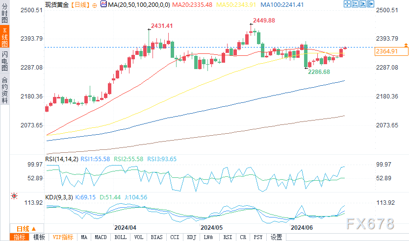 最近的上行目标是短期波动顶部2387.79美元。如果金价以强烈涨势向上突破这一水平,可能加速升至5月20日创下的245013亿美元的历史高点。
