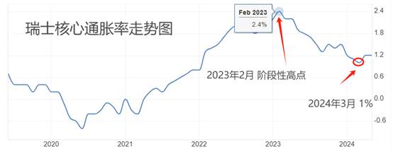 2023年2月份,瑞士的核心通胀率攀升至阶段性高点2.4%,这一数值相比欧美国家动辄8%以上的最高通胀率弱了很多,意味着瑞士国内并没有出现如欧美一般的恶性通胀。今年3月份,瑞士的核心通胀率降低至1%,如果继续下降,将会面临通缩风险。4月份和5月份的核心通胀率均为1.2%,意味着瑞士央行在3月份第一次降息起到了提振通胀率的作用。温和通胀的标准是2%,瑞士的通胀率已经连续13个月低于该标准,瑞士央行连续降息提振通胀的概率较高。