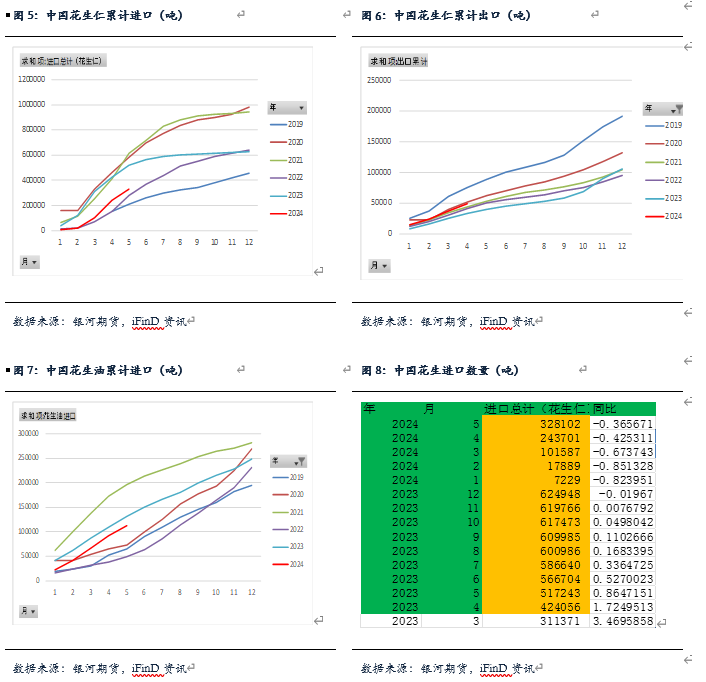 2024年1-5月花生仁进口32.8万吨,同比减少36.6%。其中塞内加尔累计进口22.8万吨,苏丹累计进口6.4万吨,美国带壳花生累计进口4.6万吨。1-4月累计出口花生仁4.96万吨,同比增48%。