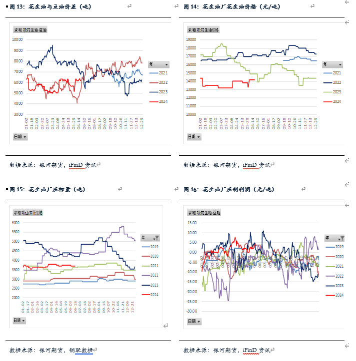 根据FAS数据,预计2024年全球花生产量5132万吨,其中中国产量1900万吨(注:这个数据和国粮中心是一样的,我们认为这个数据远高于市场数据,仅供参考),美国产量288万吨,印度产量710万吨,苏丹产量200万吨,塞内加尔产量170万吨。预计2024年全球花生消费5044万吨,其中中国消费1910万吨,印度消费608万吨。2023年全球油脂第一大是棕榈,产量7946万吨,第二大是豆油,产量6168万吨,第三大是菜油,产量3379万吨,第四是葵花籽油,产量2166万吨,花生油产量614万吨。国内豆油消费1780万吨,菜油900万吨,棕榈605万吨,花生油326万吨,葵花籽油176万吨。花生油在国内消费比例较高,且花生油价格远高于其他主要油脂,花生的价格很大程度上取决于中粮、益海、鲁花等花生油厂的收购价格。