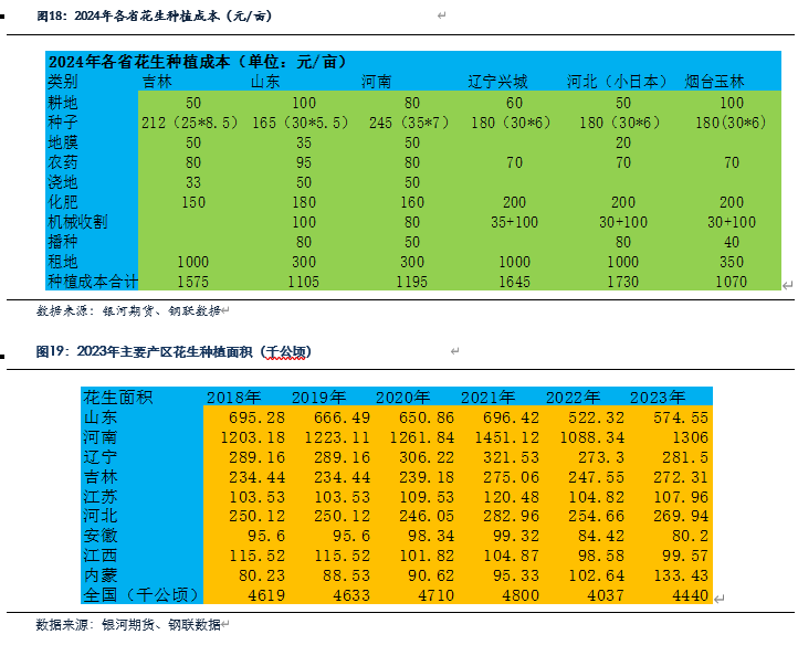 今年市场预期花生种植面积增加,产量增加。根据我们去花生产地的调研,由于种植玉米收益较低,花生收益仍较高。预计河南面积增加10-20%,吉林面积增加30%,辽宁面积增加10-20%,其他产区面积也在增加,预计2024年花生面积会增加较多,2024年全国花生面积比2023年增10%以上。2023年花生种植成本较高,吉林地区由于地租较高,种植成本大约1900元/亩,其中地租1300元/亩,其他费用630元。2024年吉林地租下降,种植成本减少,2024年吉林的种植成本在1600元/亩左右。花生与大豆、玉米等农作物相比,收益较好。河南和山东产地,农户大部分是自有土地,种植成本基本在500-800元/亩,花生米亩产在400斤左右,即使按照4.0元/斤计算,花生收益也高于玉米。