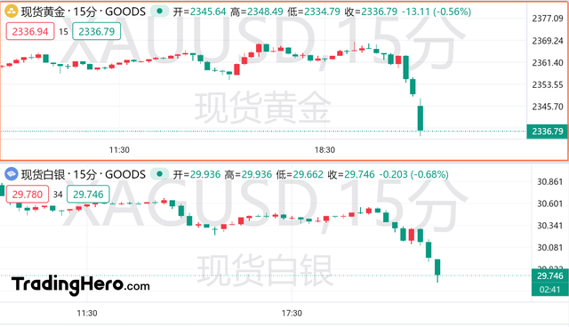 美国制造业和服务业PMI数据公布后,现货黄金短线跳水,日内跌幅达1%,失守2340美元关口。现货白银跌破30大关,日内走低逾3%。