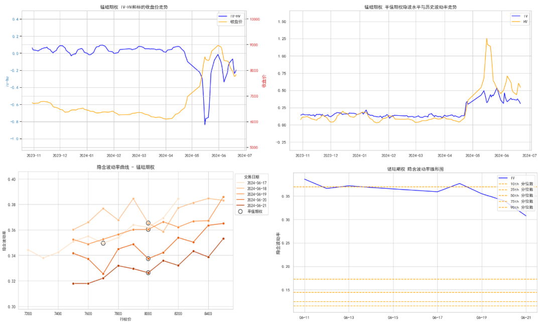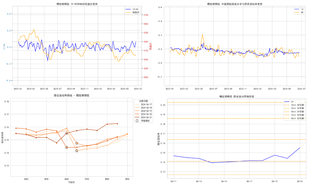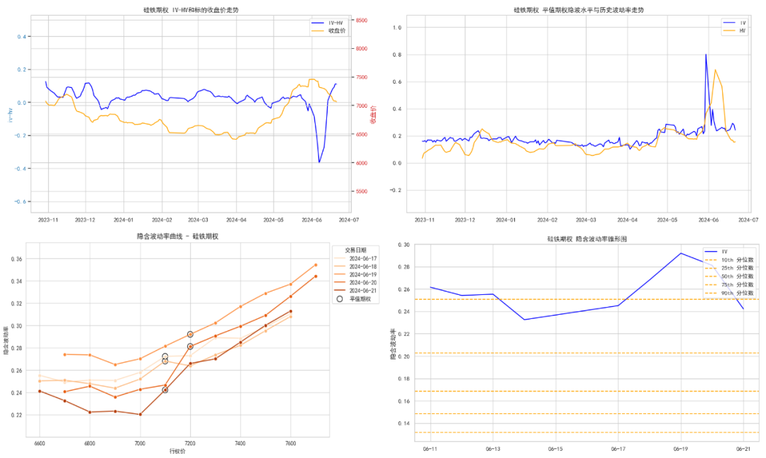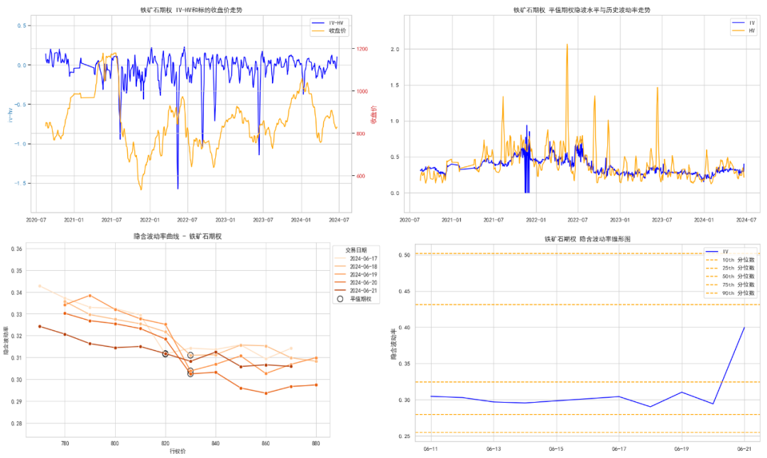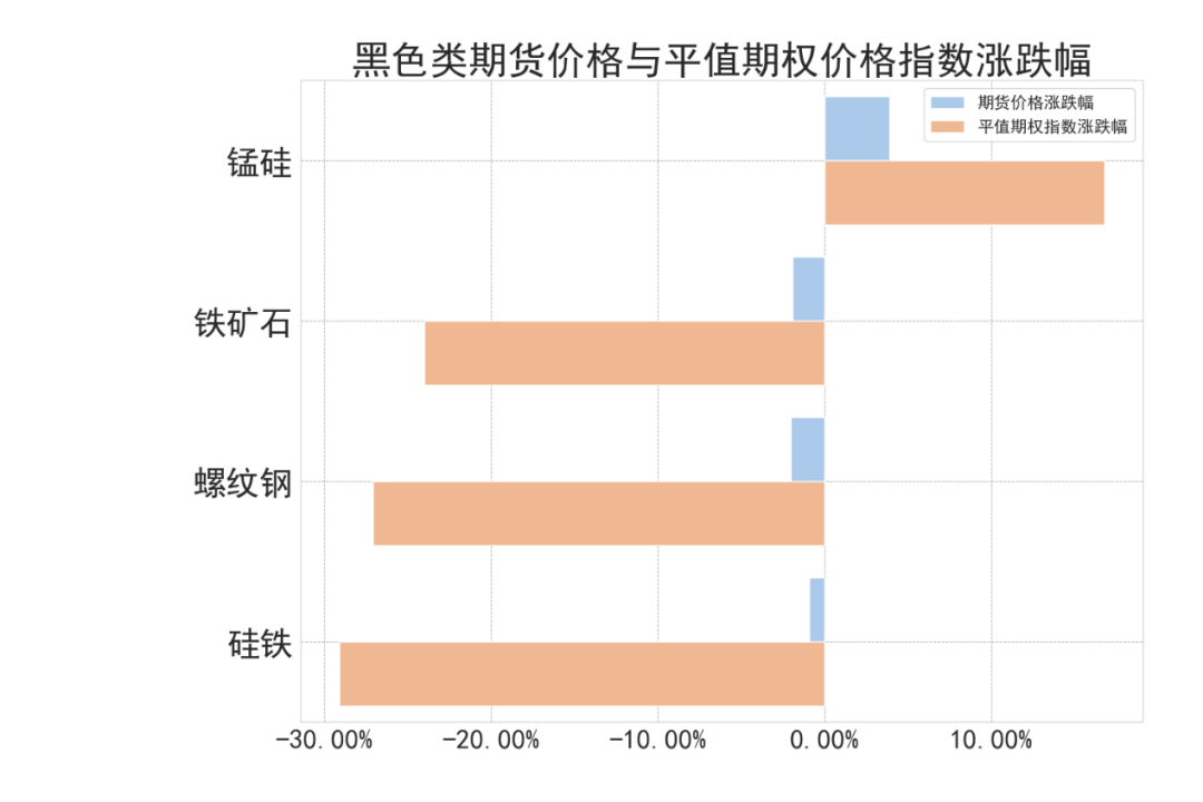 标的价格&平值期权价格指数:黑色类期货价格波动不一,锰硅涨幅为:3.88%。硅铁跌幅为:0.93%,铁矿石跌幅为:1.93%。平值期权价格指数方面,锰硅较上周有较大涨幅,涨幅为:16.78%铁矿石较上周有较大跌幅,跌幅为:24.00%,螺纹钢较上周有较大跌幅,跌幅为:27.10%;