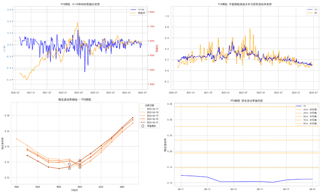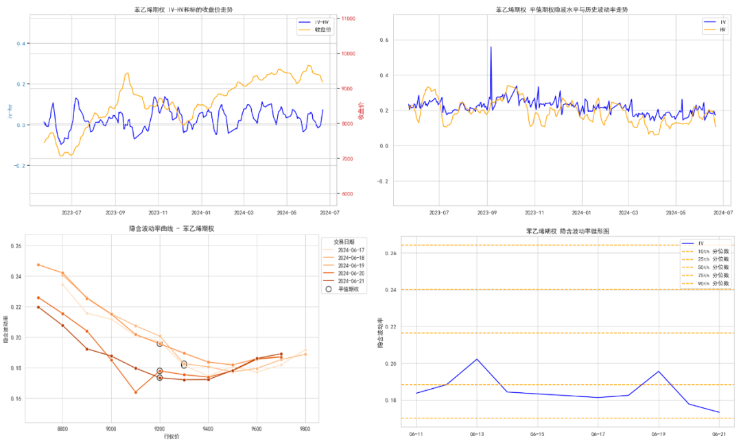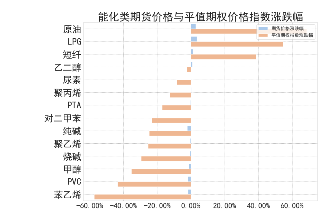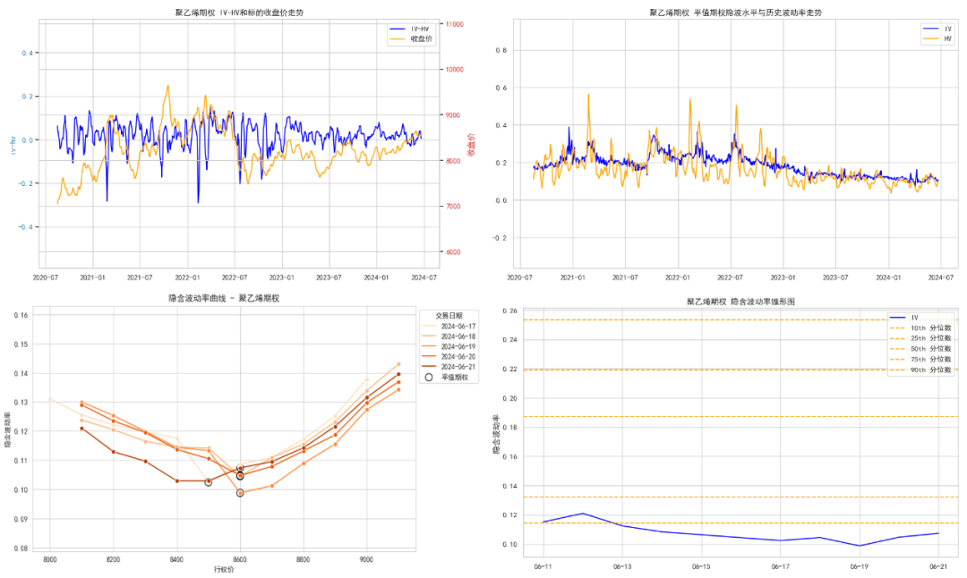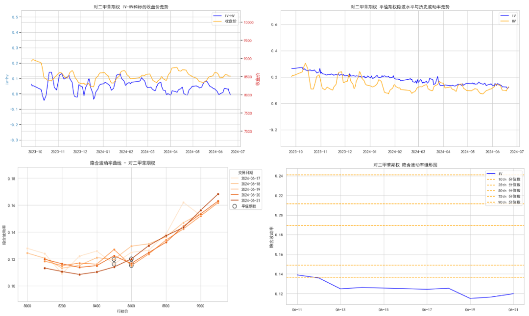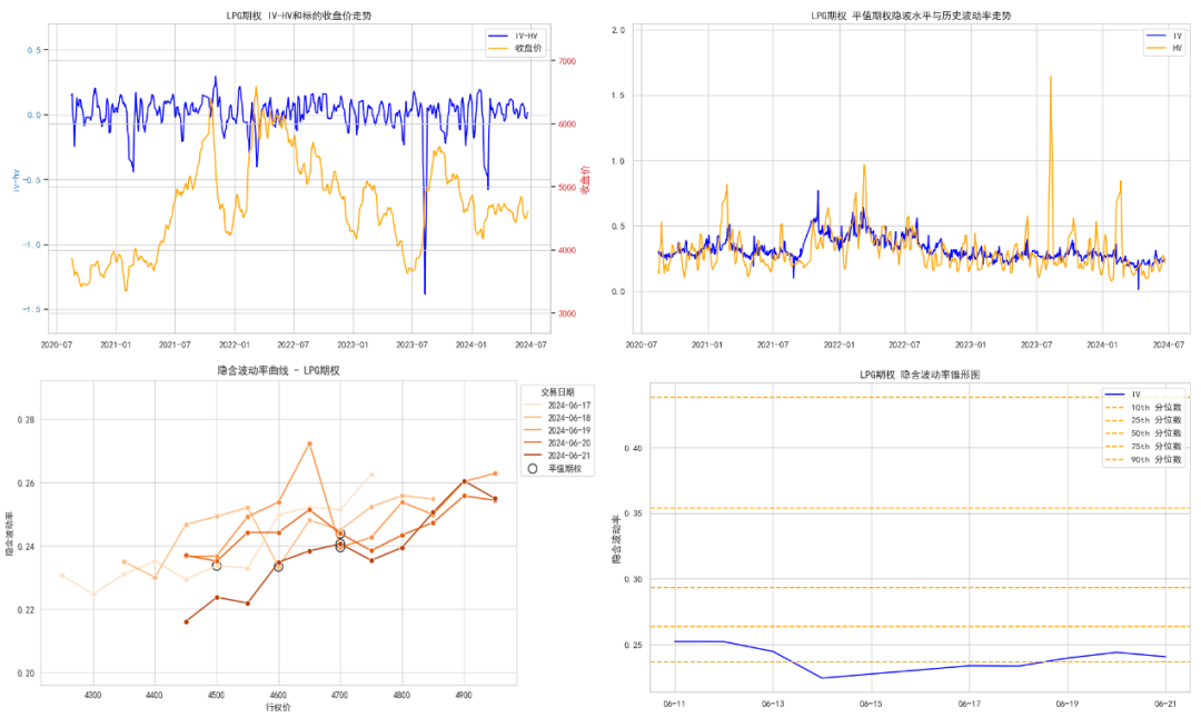标的价格&平值期权价格指数:能化类期货价格波动不一,LPG涨幅为:3.51%,原油涨幅为:2.90%。尿素跌幅为:0.05%,对二甲苯跌幅为:0.16%。平值期权价格指数方面,原油较上周有较大涨幅,涨幅为:68.63%,LPG较上周有较大涨幅,涨幅为:54.78%乙二醇跌幅为:2.44%,尿素较上周有较大跌幅,跌幅为:8.39%;