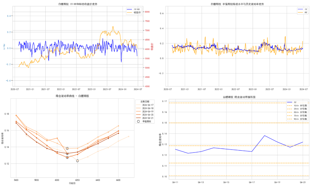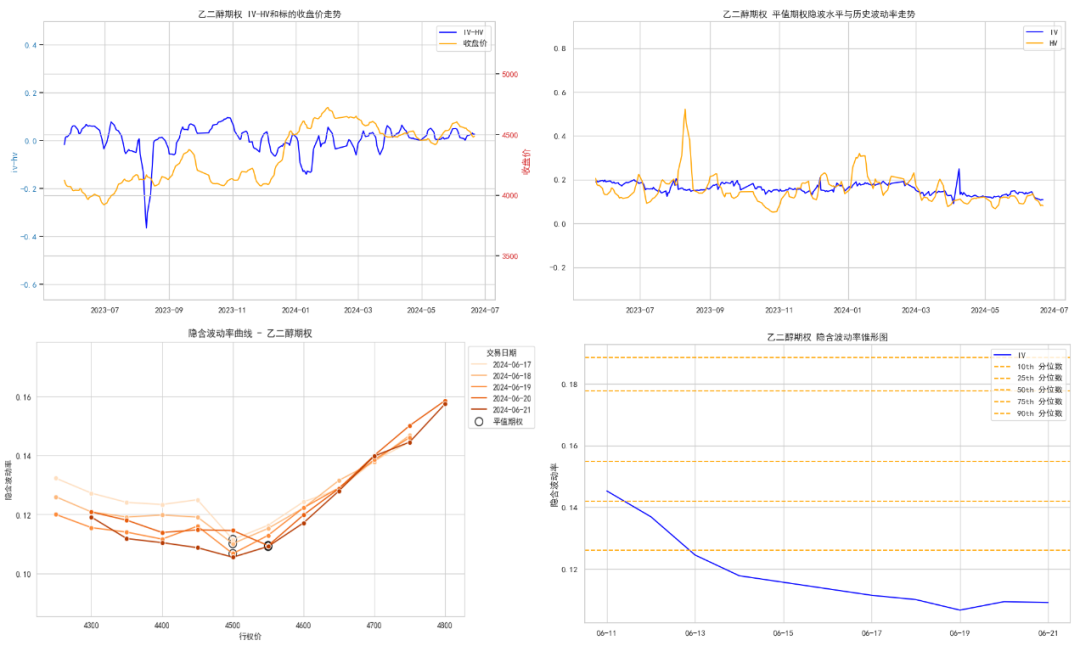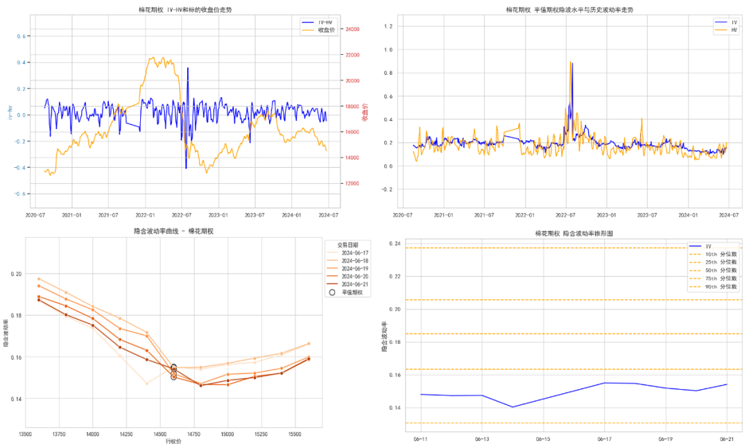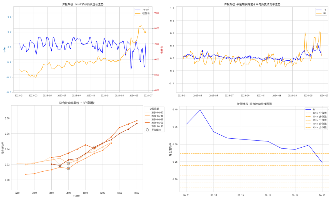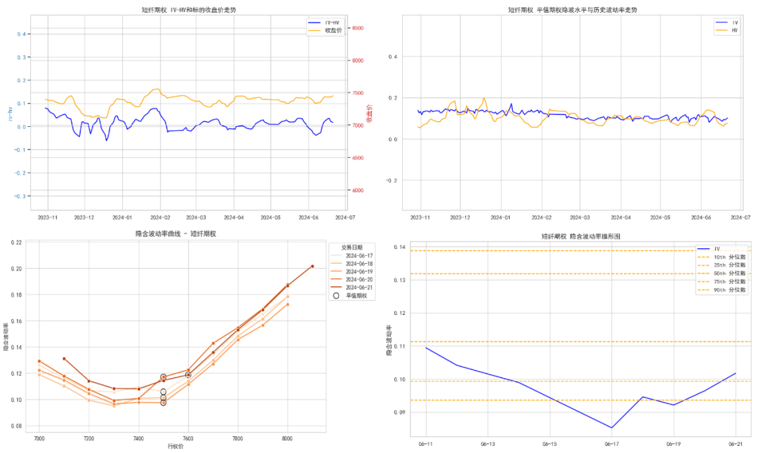 沪金期权隐含波动率(IV)与历史波动率(HV)的差值为0.11,隐含波动率(IV)显著大于历史波动率(HV)。根据IV-HV差值回归模型,后续可以关注差值情况并选择在合适的IV或HV值进行套利交易。