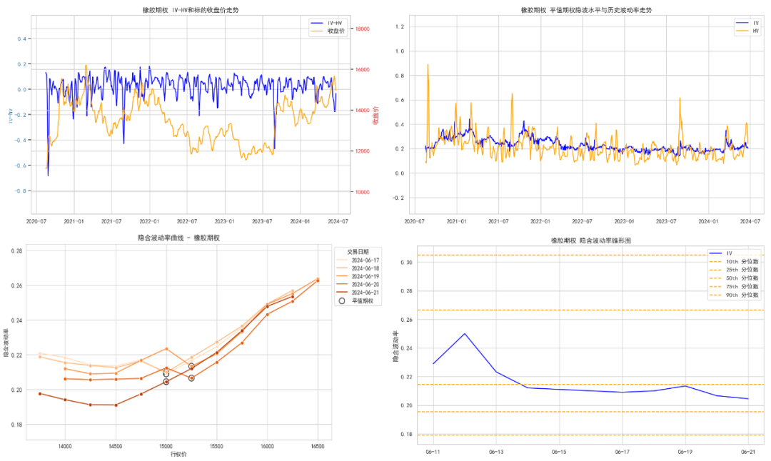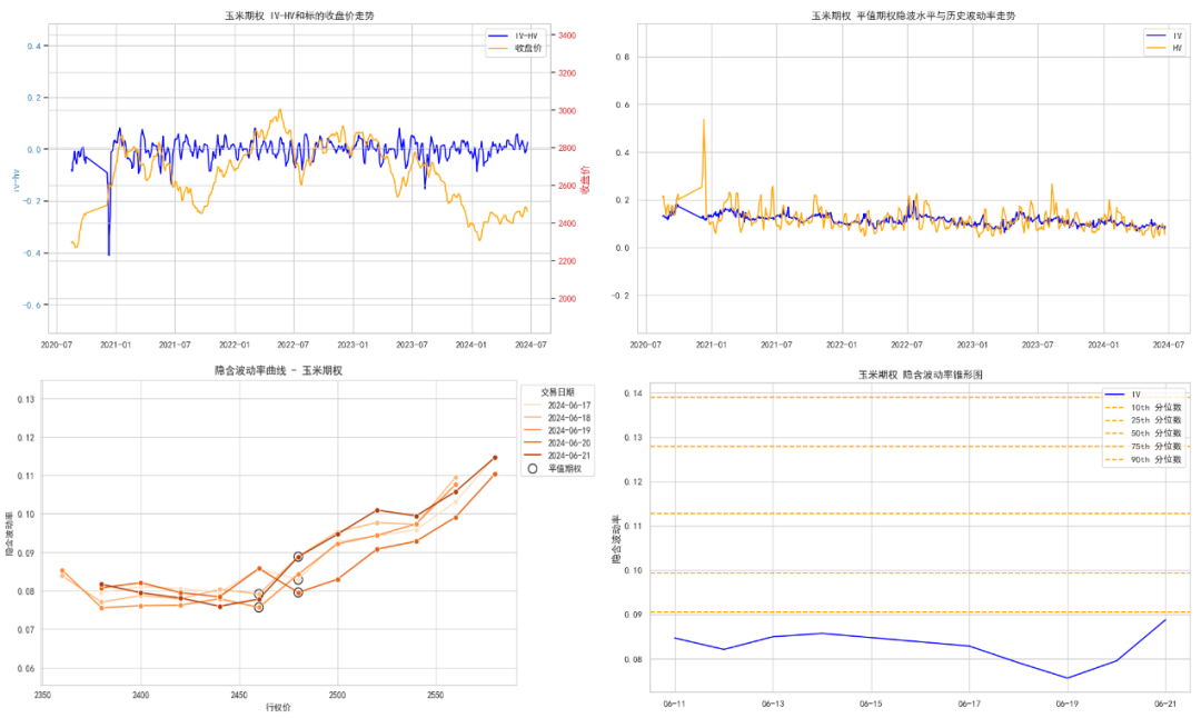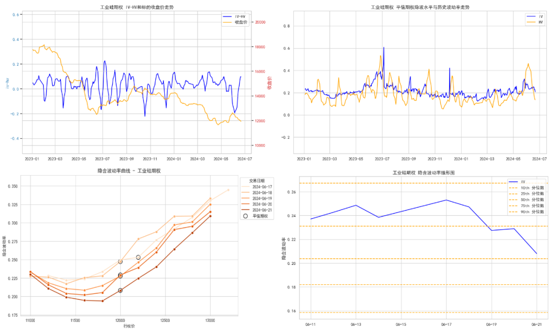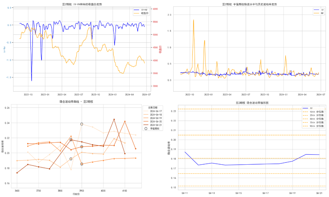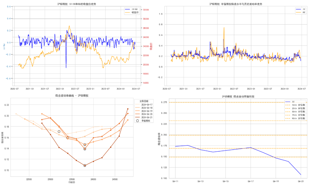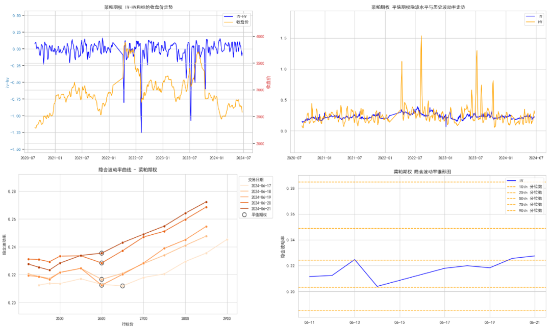 沪金期权隐含波动率(IV)与历史波动率(HV)的差值为0.11,隐含波动率(IV)显著大于历史波动率(HV)。根据IV-HV差值回归模型,后续可以关注差值情况并选择在合适的IV或HV值进行套利交易。