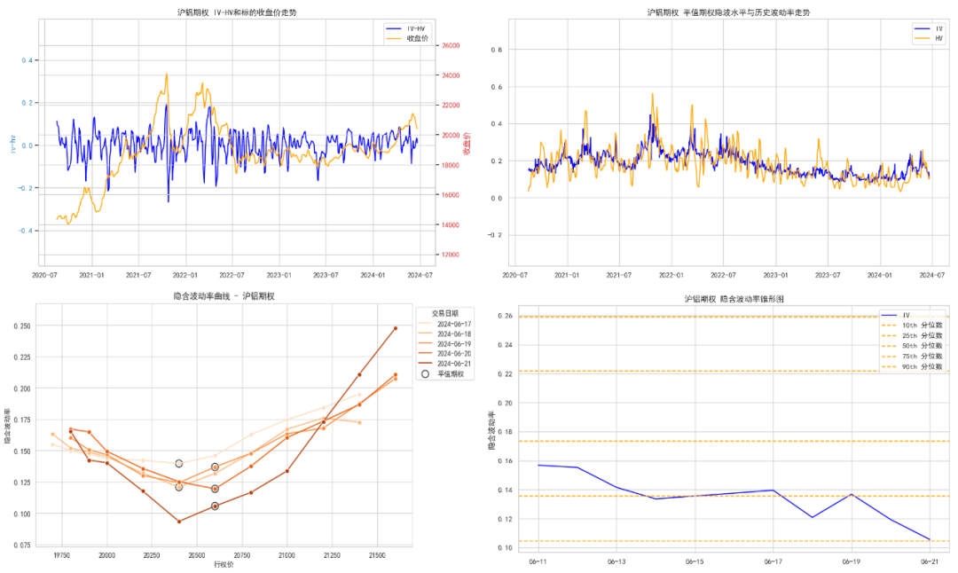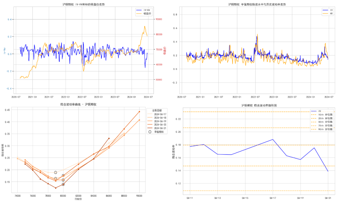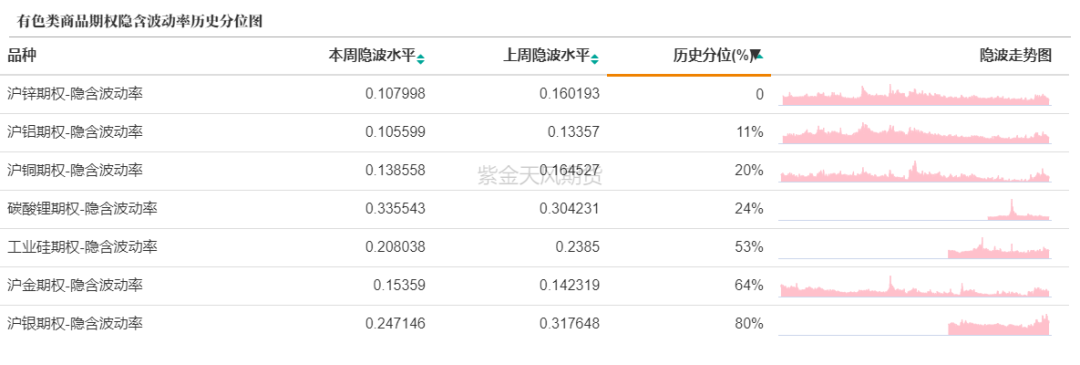 隐含波动率回顾:本周有色类商品期权各个品种主力合约隐含波动率,大多处于较低历史区间。