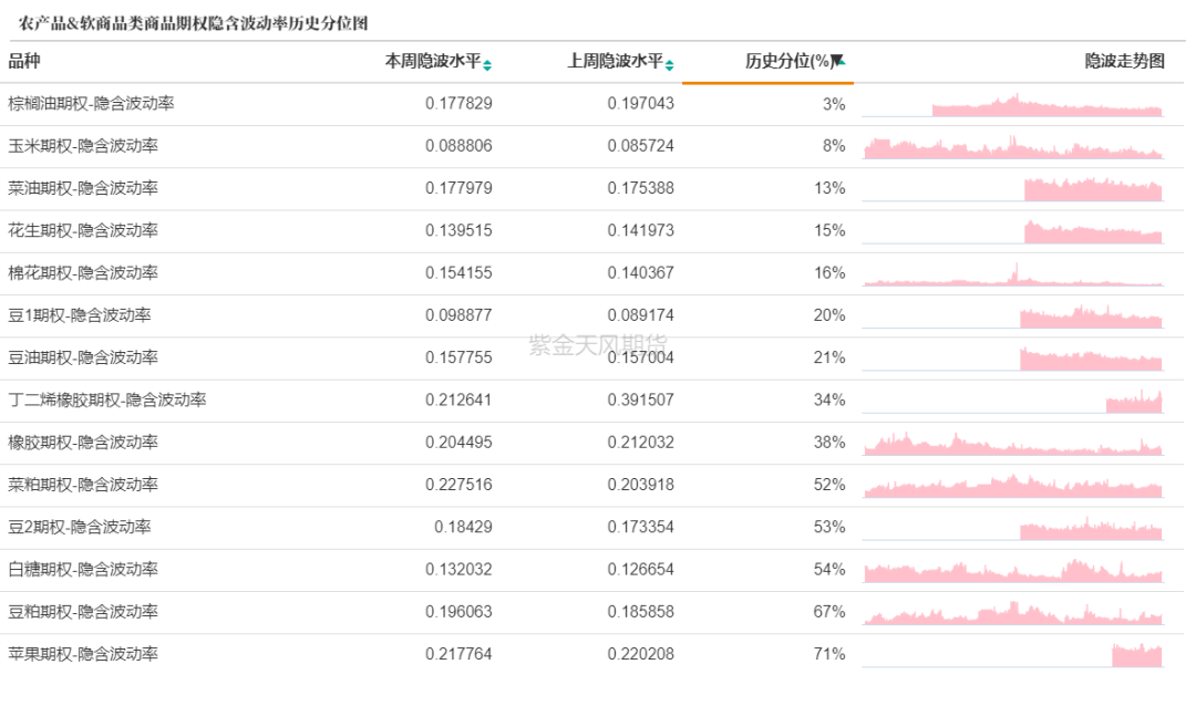 隐含波动率回顾:本周农产品&软商品类商品期权各个品种主力合约隐含波动率,大多处于较低历史区间。