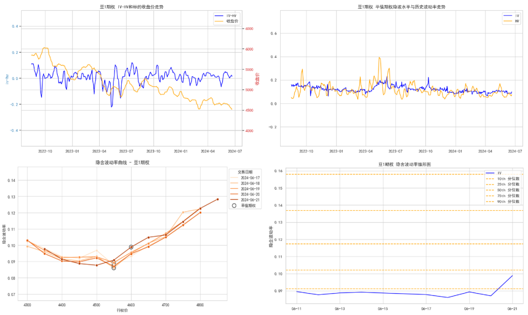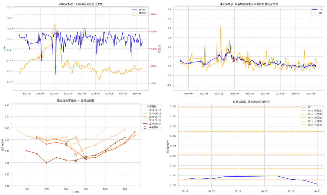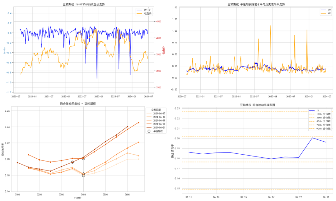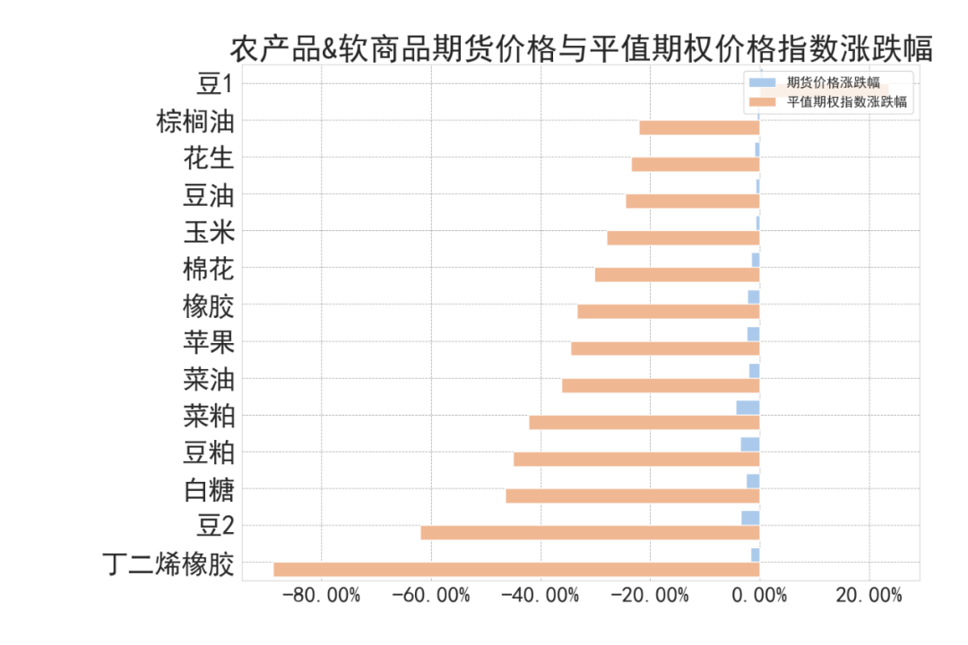 标的价格&平值期权价格指数:农产品&软商品期货价格波动不一,豆1涨幅为:0.62%。棕榈油跌幅为:0.52%,玉米跌幅为:0.72%。平值期权价格指数方面,豆1较上周有较大涨幅,涨幅为:23.60%棕榈油较上周有较大跌幅,跌幅为:22.07%,花生较上周有较大跌幅,跌幅为:23.43%;