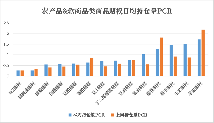 农产品&软商品期权:本周日均持仓量PCR指标中,农产品&软商品商品期权指标涨跌不一,市场多空情绪分化明显。橡胶期权本周持仓量PCR数值为0.54,白糖期权本周持仓量PCR数值为0.57,豆粕期权本周持仓量PCR数值为0.59,菜粕期权本周持仓量PCR数值为0.64,豆1期权本周持仓量PCR数值为0.70,市场短期看空情绪较强;丁二烯橡胶期权本周持仓量PCR数值为0.72,豆油期权本周持仓量PCR数值为0.75,菜油期权本周持仓量PCR数值为1.03,期货价格可能出现短期震荡局面;豆2期权本周持仓量PCR数值为0.26,市场短期看空情绪强烈;棕榈油期权本周持仓量PCR数值为0.27,市场短期看空情绪强烈;棉花期权本周持仓量PCR数值为1.27,市场短期看多情绪较强;花生期权本周持仓量PCR数值为1.46,市场短期看多情绪较强;玉米期权本周持仓量PCR数值为1.51,市场短期看多情绪强烈;苹果期权本周持仓量PCR数值为1.72,市场短期看多情绪强烈。