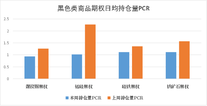 黑色类商品期权:本周日均持仓量PCR指标中,黑色类商品期权指标均有不同程度下跌。螺纹钢期权本周持仓量PCR数值为0.93,锰硅期权本周持仓量PCR数值为1.02,硅铁期权本周持仓量PCR数值为1.11,铁矿石期权本周持仓量PCR数值为1.12,期货价格可能出现短期震荡局面。