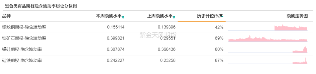 隐含波动率回顾:本周黑色类商品期权各个品种主力合约隐含波动率,大多处于较高历史区间。