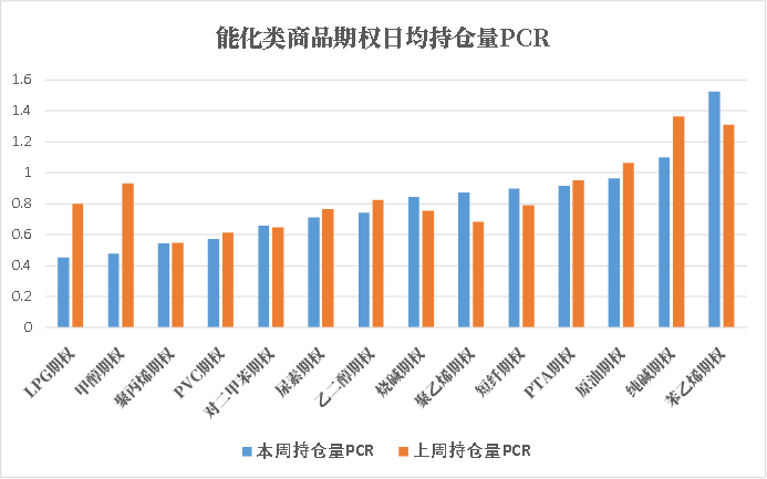 市场情绪方面:本周日均持仓量PCR指标中,能化类商品期权指标涨跌不一,市场多空情绪分化明显。LPG期权本周持仓量PCR数值为0.45,市场短期看空情绪较强;苯乙烯期权本周持仓量PCR数值为1.52,市场短期看多情绪强烈;