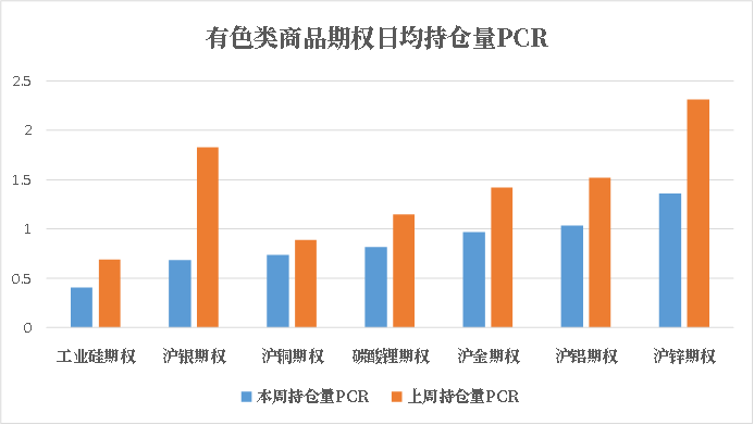 市场情绪方面:本周日均持仓量PCR指标中,有色类商品期权指标均有不同程度下跌。工业硅期权本周持仓量PCR数值为0.41,市场短期看空情绪较强;沪锌期权本周持仓量PCR数值为1.36,市场短期看多情绪较强;