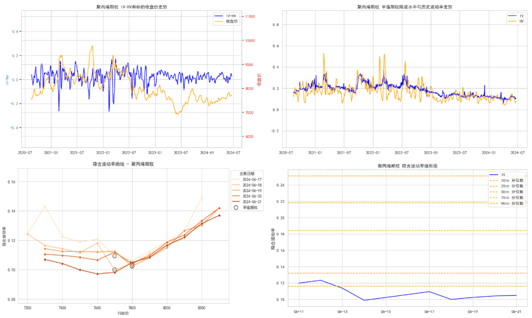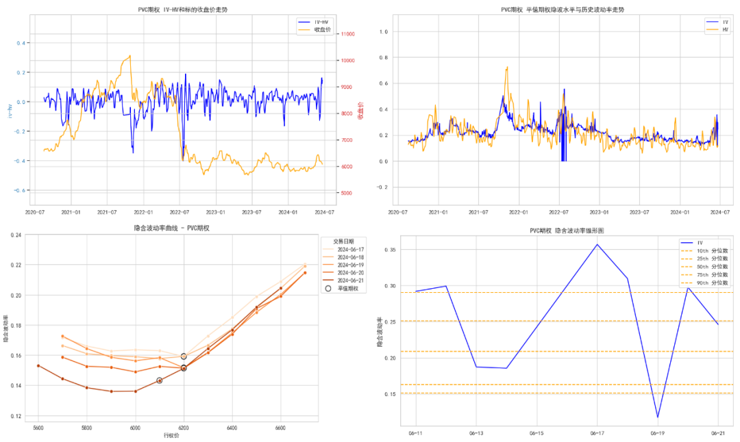 能化类商品期权:本周能化类商品期权各个品种主力合约隐含波动率,大多处于较低历史区间。甲醇期权隐含波动率历史分位数历史新低,烧碱期权隐含波动率历史分位数为1%,乙二醇期权隐含波动率历史分位数为1%,对二甲苯期权隐含波动率历史分位数为1%,原油期权隐含波动率历史分位数为2%,PTA期权隐含波动率历史分位数为2%,聚丙烯期权隐含波动率历史分位数为4%,聚乙烯期权隐含波动率历史分位数为5%,苯乙烯期权隐含波动率历史分位数为11%,LPG期权隐含波动率历史分位数为11%,处于较低历史区间,PVC期权隐含波动率历史分位数为73%,处于较高历史区间。根据波动率均值回归角度判断,可以关注隐含波动率后续向历史均值的回归。