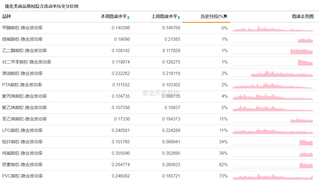 隐含波动率回顾:本周能化类商品期权各个品种主力合约隐含波动率,大多处于较低历史区间。