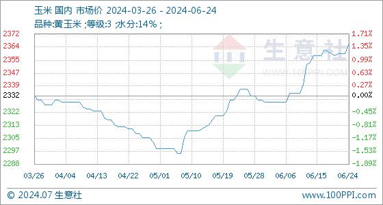 6月24日,生意社玉米基准价为2360.00元/吨,与本月初(2328.57元/吨)相比,上涨了1.35%。
