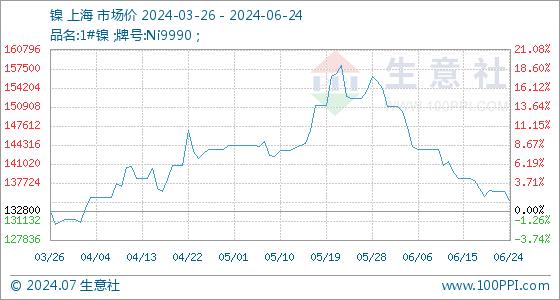 6月24日,生意社镍基准价为136258.33元/吨,与本月初(150966.67元/吨)相比,下降了-9.74%。