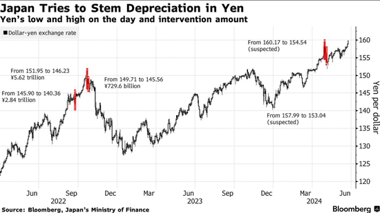 神田发表讲话时,日元兑美元汇率离160关口不远,接近4月29日创下的160.17的34年低点。日本当局在4月底和5月初采取了创纪录的干预措施来支持日元。