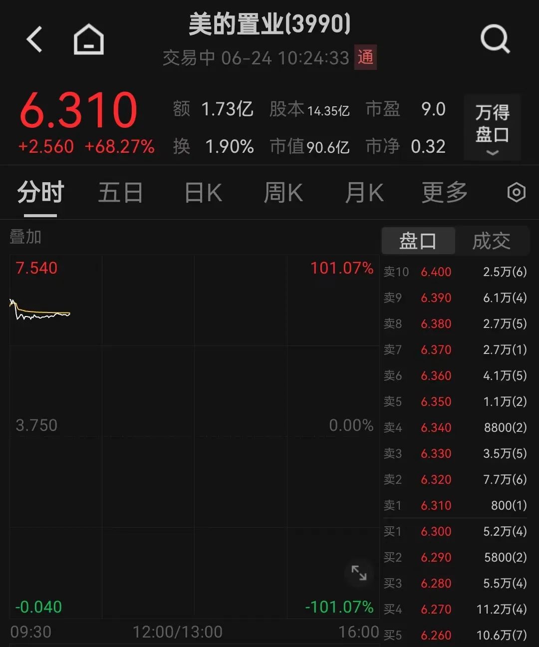 6月24日早盘,港股美的置业盘初暴涨超100%。截至发稿,仍然涨超68%。
