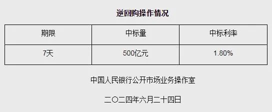 6月24日早间,央行公告称,为维护半年末流动性平稳,6月24日以利率招标方式开展了500亿元7天期逆回购操作,中标利率为1.8%。