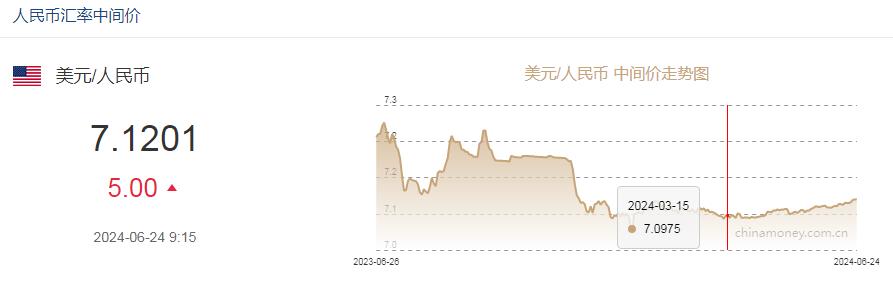 中国发展网讯6月24日,据中国外汇交易中心网站消息,中国人民银行授权中国外汇交易中心公布,2024年6月24日银行间外汇市场人民币汇率中间价为:1美元对人民币7.1201元。