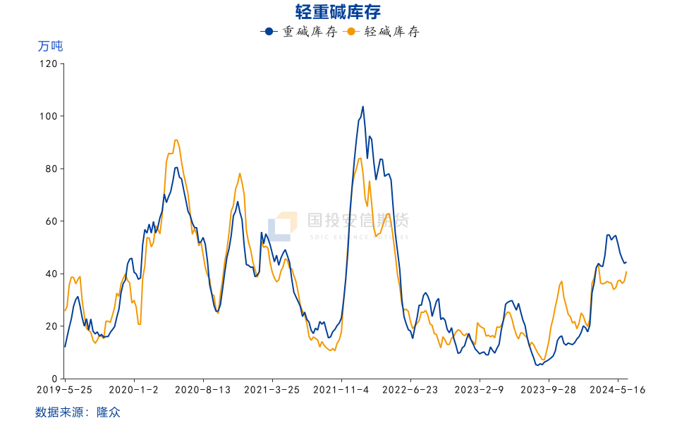 5月份,纯碱现货继续提价,压缩下游利润,浮法玻璃冷修量增多,但由于玻璃冷修成本较高,目前仍不具备大量冷修驱动力,对纯碱的消费减少影响不大,另外光伏玻璃继续点火,抵消浮法的损失,重碱整体刚需支撑强,但下游存在高价抵触情绪,刚需消耗为主,原料库存近期有所下降。轻碱下游受影响更大,部分轻碱下游成本压力增加明显,开工负荷下降,日用玻璃听闻个别产线停产;味精行业开工负荷率维持在87.1%,市场价格有所下滑;小苏打厂家整体开工负荷率在93%,盈利空间收窄。轻碱价格阴跌,库存也呈现累加格局,对纯碱需求消耗量减少。