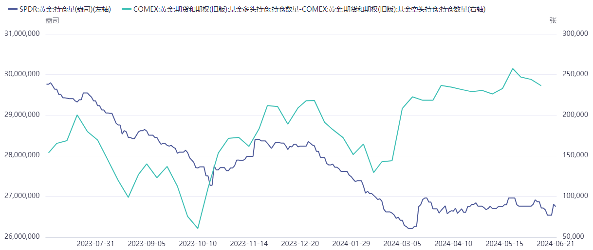 图四. 黄金ETF持仓和COMEX黄金期货净多头持仓