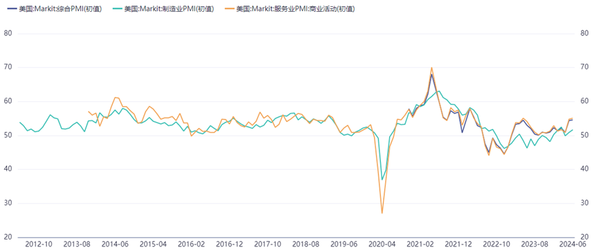 但是,上周五标普全球公布的数据显示,制造业PMI初值51.7,创3个月新高,也是连续第二个月扩张,好于预期的51。服务业PMI初值55.1,创26个月新高,好于预期的54,超过媒体调查的所有经济学家的预期。综合PMI初值54.6,创26个月新高,好于预期的53.5。美国6月Markit PMI初值数据全线好于预期,表明整体商业活动显示出韧性,市场降息预期遭受打击,金银承压回落。