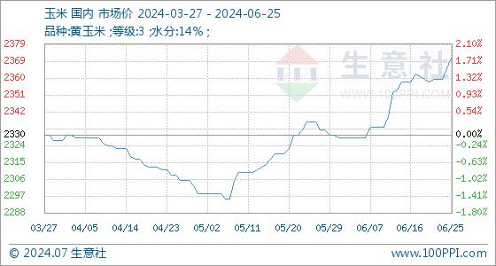 6月25日,生意社玉米基准价为2365.71元/吨,与本月初(2328.57元/吨)相比,上涨了1.59%。