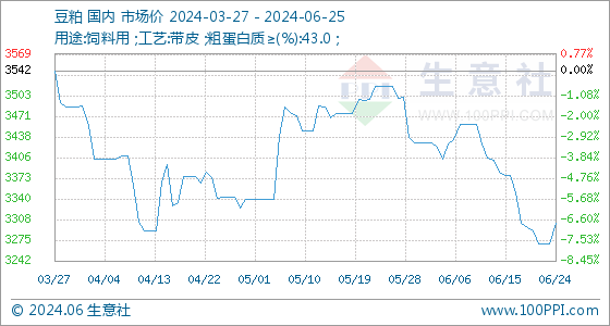 6月25日,生意社豆粕基准价为3302.00元/吨,与本月初(3430.00元/吨)相比,下降了-3.73%。
