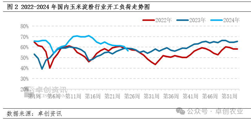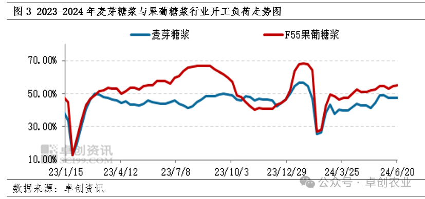 淀粉糖作为玉米淀粉最主要的下游消费,占比接近40%,进入6月份之后,由于各地气温回升速度出现差异,导致淀粉糖需求放量缓慢。其中华南与华东等南方地区,受连续降雨影响,气温回升速度偏慢,下游制糖行业需求放量缓慢。山东、河南等地气温回升速度偏快,饮料、冷饮及啤酒等需求逐步复苏,带动下游液体糖(麦芽糖浆、果葡糖浆及葡萄糖浆等)需求量增加。据卓创资讯数据监测,2024年第25周国内麦芽糖浆行业开工负荷为47.39%,较上周降低0.09个百分点。F55果葡糖浆行业开工负荷为55.14%,环比上周增加0.60个百分点。由于下游需求端放量缓慢,对于价格形成利空压制。