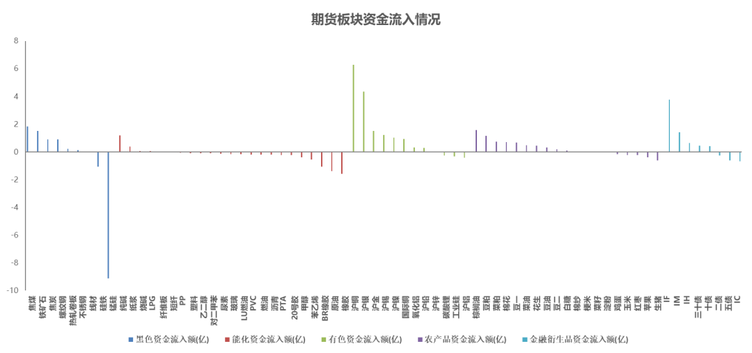 从板块资金流动情况来看,有色、股指多数流入,能化多数流出。