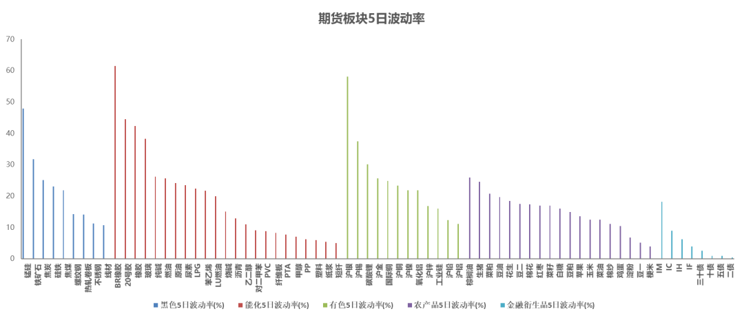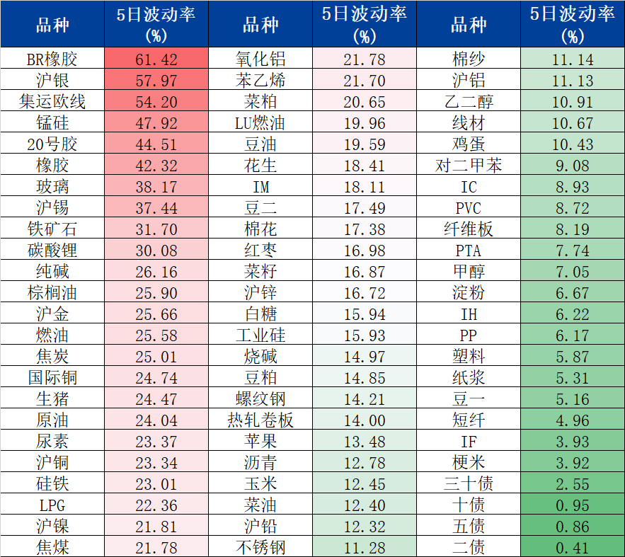 从5日波动率水平看,前三位为BR橡胶、沪银和集运欧线;低波动前三品种为二债、五债和十债。