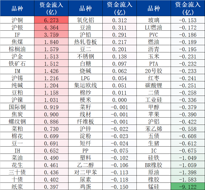 资金流入前三名为沪铜、沪银和IF;流出前三名分别为锰硅、橡胶和原油。