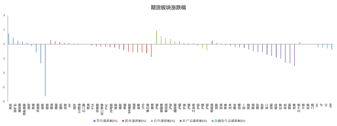 从板块整体表现看,有色多数上涨,能化、农产品多数下跌。