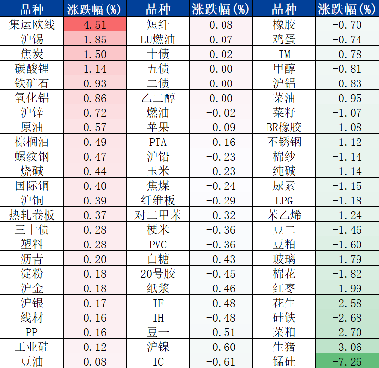 涨幅居前的三个品种分别是集运欧线、沪锡和焦炭;跌幅居前的是锰硅、生猪和菜粕。