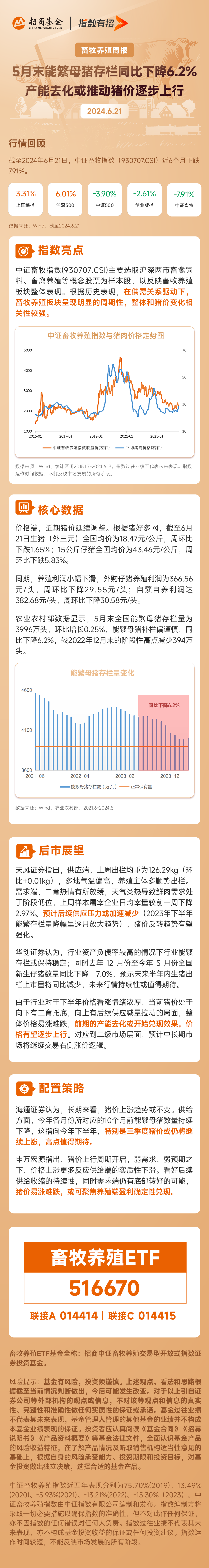 5月末能繁母猪存栏同比下降6.2%,产能去化或推动猪价逐步上行