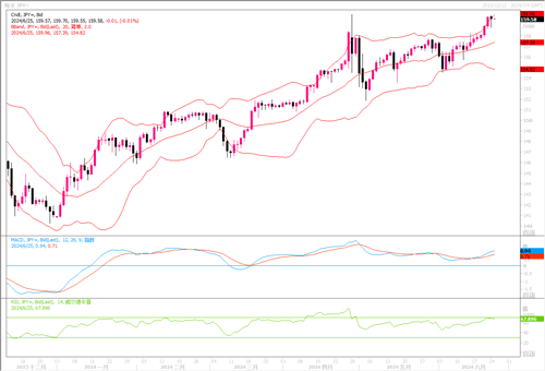 周一(6月24日),美元兑日元从八周高点下滑,在欧洲时段一度跌至158.75,纽约尾盘回升收盘报159.65,当日微微下跌0.1%。在美元/日元连续上涨七天后,交易员重新警惕日本政府入市干预,导致早盘阶段有获利回吐盘的出现,一度打压了美元的涨势。早些时候,日本财务省财务官神田真人表示,如果出现过度汇率波动,当局将酌情采取行动,美国财政部将日本列入汇率操纵监控名单不会限制他们的行动。日本当局过往的操作也表明,他们并不针对某个特定水平。为此,在美元/日元不断逼近年内高点的情势下,交易员对于随时可能出现干预还是保有戒心。只是在巨大利差吸引力的推动下,预料套利交易推高美元的趋向恐怕短时期内不易扳转。日线图上,各项技术指标继续维持上顷,美元多头动能未显衰竭。目前就看上方的心里关口160能否被上穿,若仍不能穿破,则当心形成阶段的双顶形态。