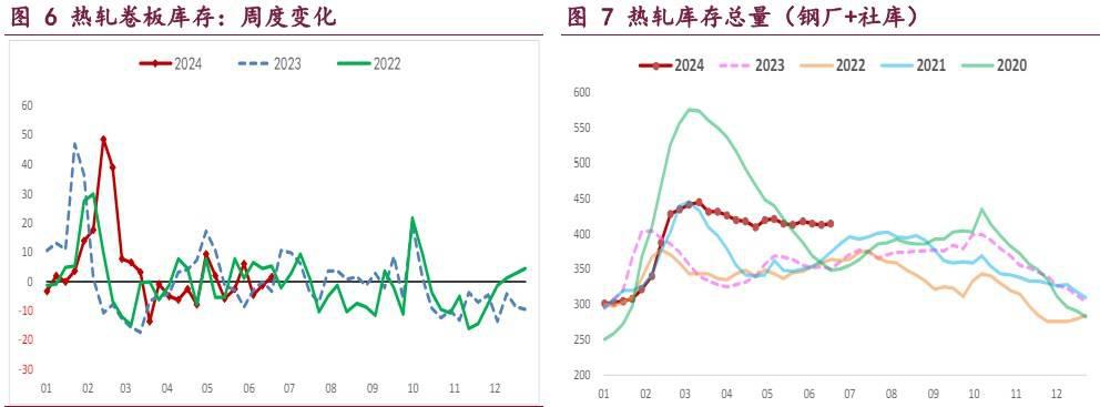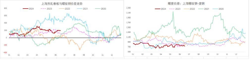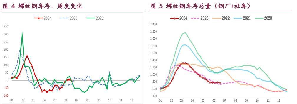 与此同时,螺纹需求弱势未变,周度表需环比微增 8.66 万吨,而高频每日成交则是延续缩量,两者均显著低于去年同期水平,考虑到华东入梅以及北方高温天气,后续需求仍将走弱,淡季需求特征显现,而政策利好短期难以带来需求增量,弱势需求继续抑制钢价。