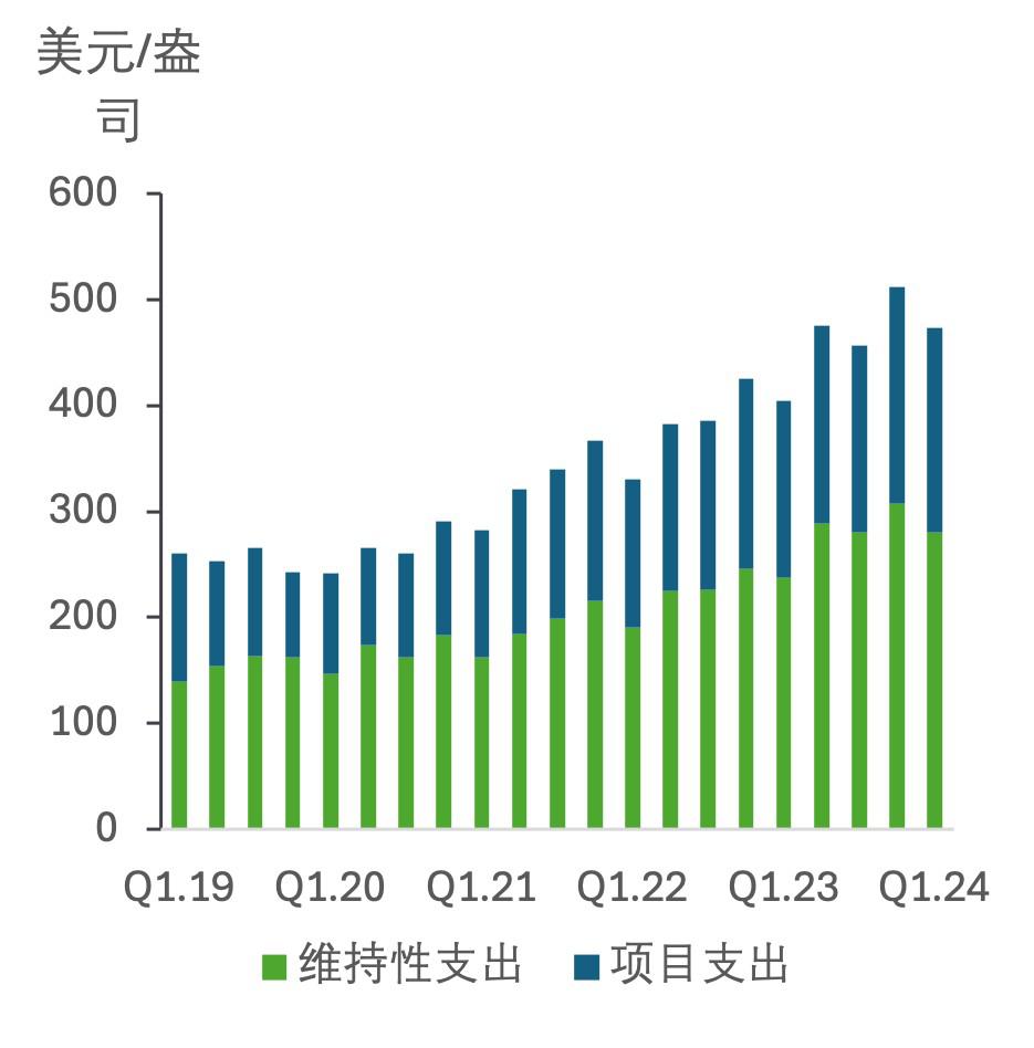2024年一季度单位产品的维持性资本支出额下降21%,至280美元/盎司。2016年一季度该项支出触及134美元/盎司的低点,历史高点则为2012年三季度创出的351美元/盎司。据我们估算,为维持当前产量水平,维持性资本支出额需要接近300美元/盎司。一季度单位产品的项目资本支出额下降6%,至193美元/盎司。多家黄金生产商都报告称其一季度的项目资本支出额下降。