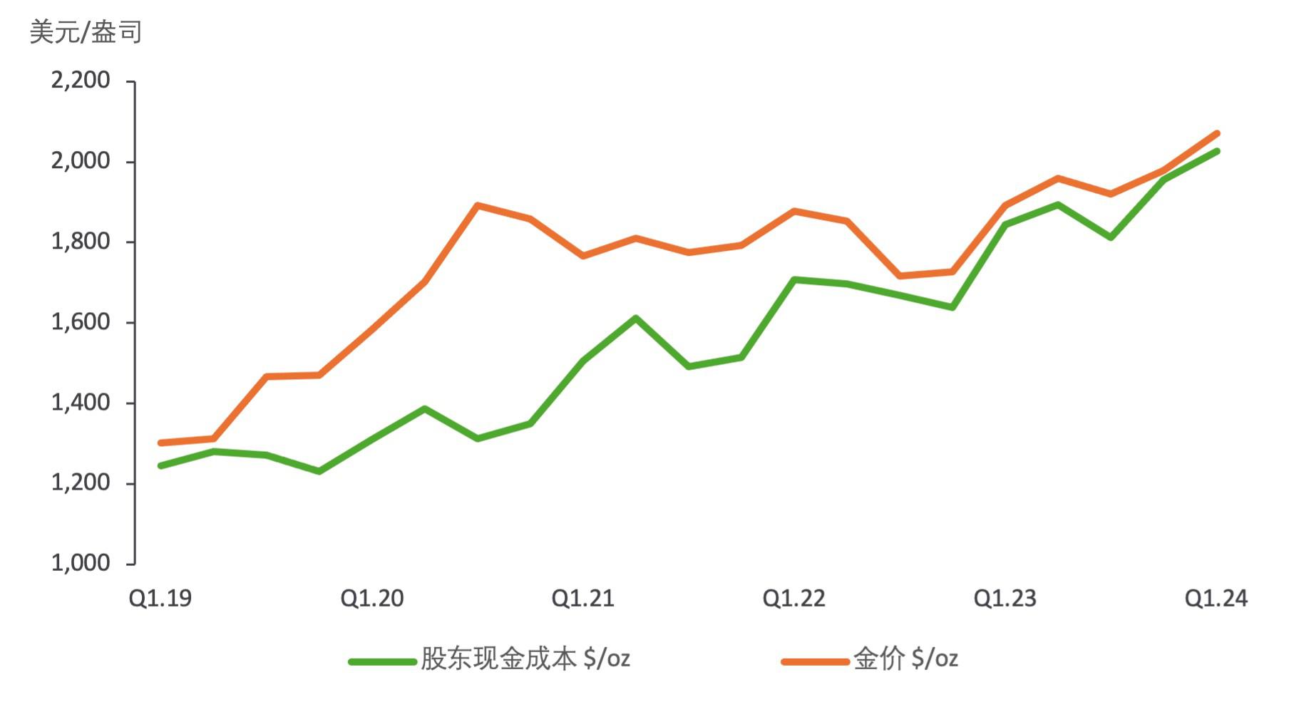 另一个也许更有趣的现金成本衡量指标是我们所称的“股东现金成本”,包含总维持成本、项目资本支出、以现金缴纳的税金、利息、矿产资源权益金等各项现金成本。扣除后剩余的资金可用于派发股息、偿还债务或进行企业并购活动。2024年一季度纳入同业分析黄金矿企的股东现金成本为2,027美元/盎司,环比和同比分别上升4%和10%。虽然成本不断上升,一季度这些矿企的现金利润率仍为正值,达44美元/盎司,相当于金价的2%,不过仍远低于2020年三季度创出的现金利润率峰值575美元/盎司。