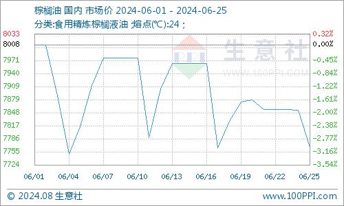 据生意社商品行情分析系统显示:6月棕榈油行情弱势振荡,跌幅整体超3%。6月1日,棕榈油市场均价8008元/吨,6月25日,棕榈油市场均价7766元/吨,价格下跌3.02%。