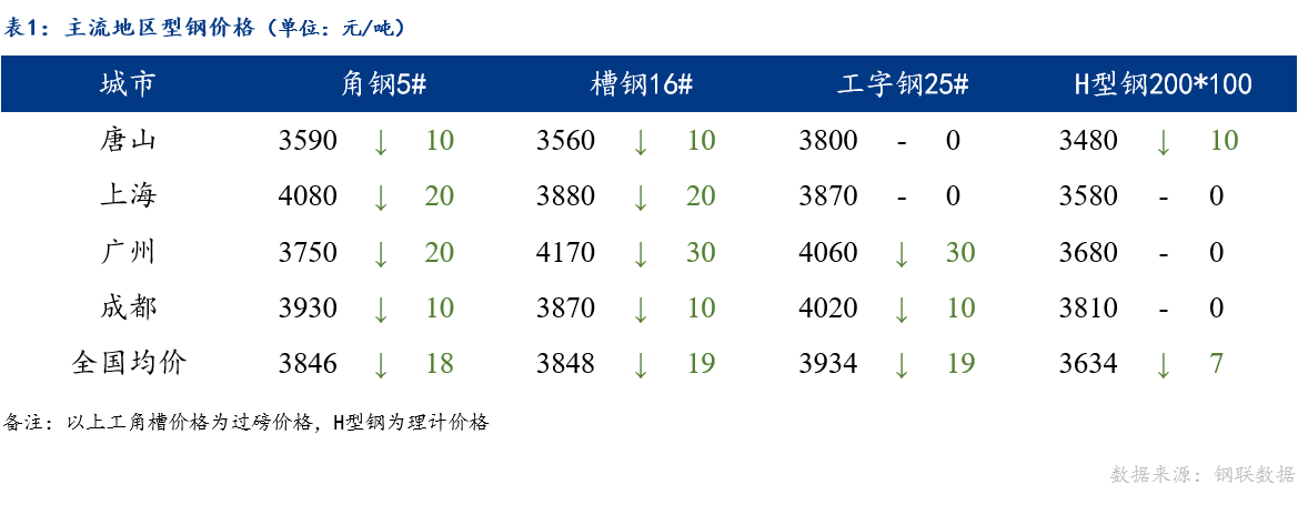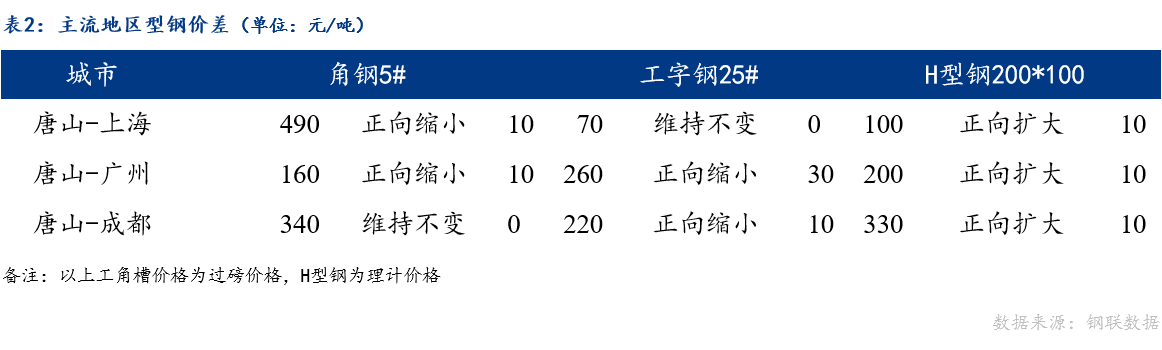 从区域价差来看,今日唐山与上海、广州角钢价差正向缩小,与成都角钢价差维持不变,唐山与上海工字钢价差维持不变,与广州、成都工字钢价差正向缩小,唐山与上海、广州、成都H型钢价差正向扩大。