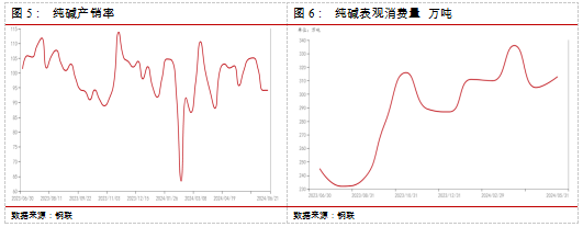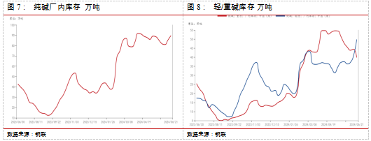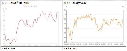 供应端,根据Mysteel数据,本周纯碱产量73.59万吨,环比增加5.17万吨,涨幅7.55%。轻质碱产量30.07万吨,环比增加1.61万吨。重质碱产量43.52万吨,环比增加3.56万吨。短期供应保持较高水平,预计纯碱开工率维持高位。从企业的检修计划看,后续仍有一些企业计划检修。供给扰动仍存。