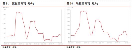 利润端,截至6月20日,中国联碱法纯碱理论利润(双吨)为674.10元/吨,环比下跌122元/吨。主要成本端煤炭价格相对稳定,而纯碱价格继续下行,故利润大幅走低。中国氨碱法纯碱理论利润489.37元/吨,环比下跌49.37元/吨。主要成本端焦炭价格下跌,纯 碱价格低位下移,故利润呈现下行。