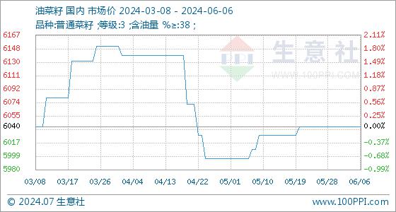6月6日,生意社油菜籽基准价为6040.00元/吨,与本月初持平。